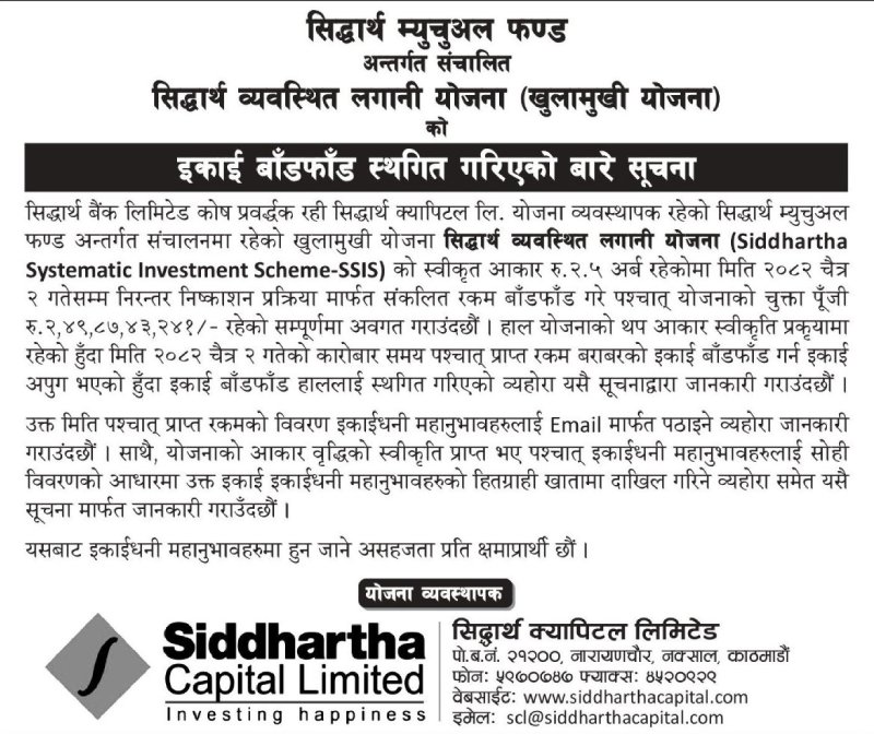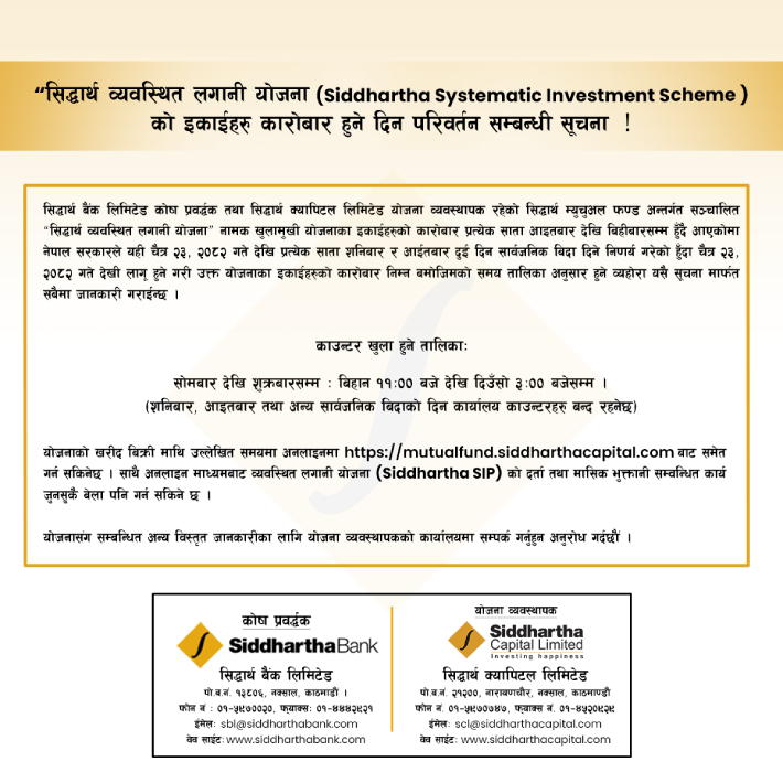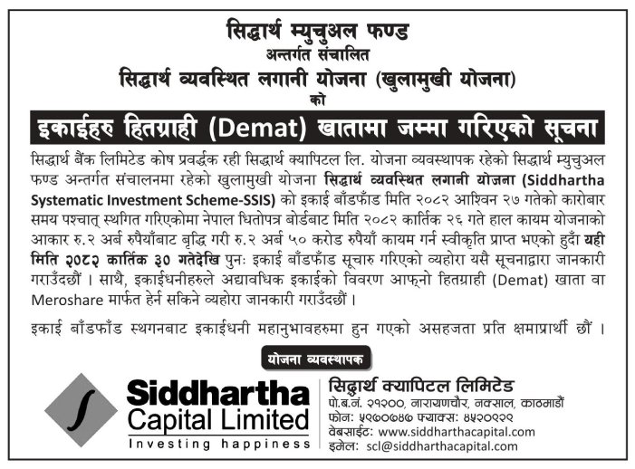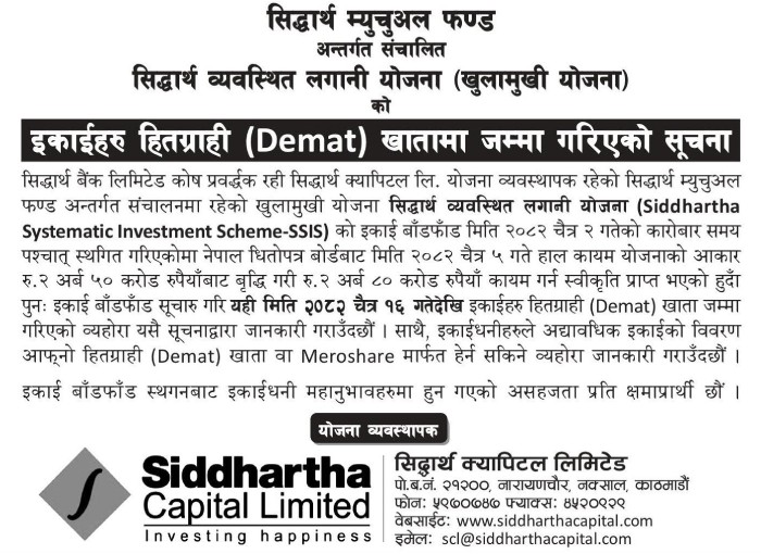 Siddhartha Systematic Investment Scheme (SSIS), is an open-end scheme with an initial corpus fund of NPR. 20 crores. The objective of the scheme is to generate long term capital appreciation and income distribution to investors from a portfolio that is predominantly invested in equity and equity related securities.