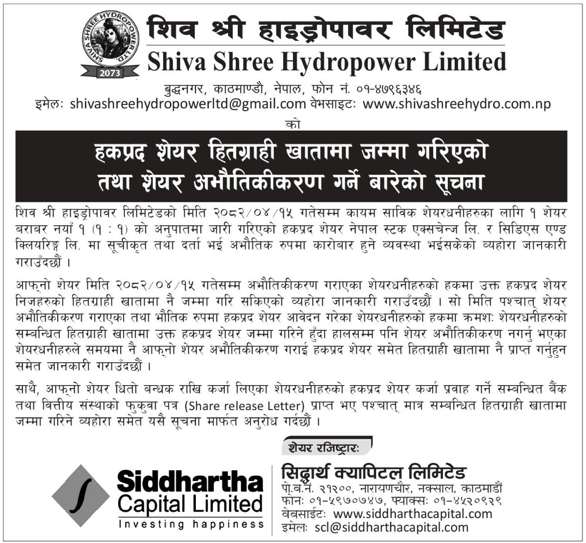 SSHL Right Share Deposit Notice